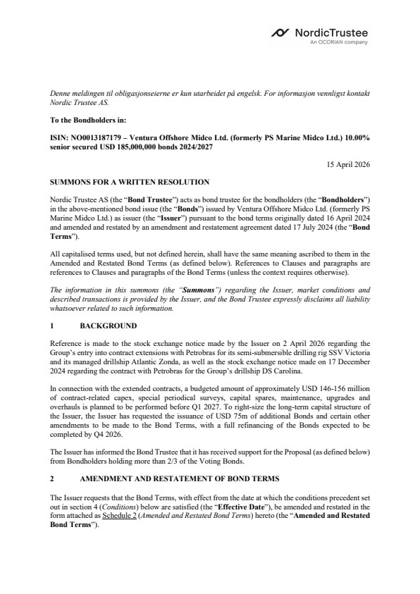 April 15, 2026 – Ventura Offshore Midco Ltd (the “Issuer”), a subsidiary of Ventura Offshore Holding Ltd (the “Company”), has today instructed Nordic Trustee AS to summon a written resolution (the “Written Resolution”) for the Issuer’s senior secured bonds maturing 19 April 2027 with ISIN NO0013187179 (the “Bonds”).
